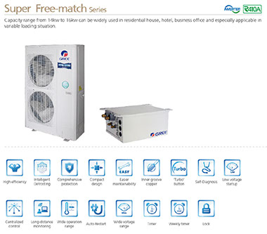 Gree Super Free Match is the latest generation of Multiple Inverter Air Conditioner, which is connectable up to 9 indoor units and offers rich choices of indoor units for different decoration requirement. With the GREE Inverter technology, the Super Free Match can achieve a high energy efficient, steady operation, highly comfort and low sound level to suit modern living environment.